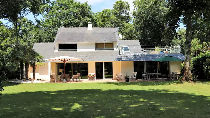 SOUS PROMESSE - LA BAULE - Villa de 207 m² sur une parcelle de 1660 m² au coeur du Domaine privé limitrophe du Golf de La Baule Sur deux niveaux, la maison se compose au rez-de-chaussée d'un entrée desservant un salon-séjour avec cheminée et grandes baies vitrées sur la terrasse orientée Sud, une salle de billard, une cuisine aménagée équipée avec arrière cuisine, une suite composée d'une chambre, un dressing et une salle de bain avec douche et baignoire, wc et dressings. A l'étage, un palier desservant trois chambres dont une avec salle de bain privative douche et sauna et une avec terrasse privative, une salle de bain supplémentaire avec douche, wc. En annexe, un grenier, un garage fermé avec grenier et porte motorisée, un abri de jardin fermé, deux carports et des stationnements extérieurs avec prise pour recharge de voitures électriques. Cette villa d'exception offre un cadre de vie paisible et luxueux, alliant confort moderne et prestations de grande qualité. Idéale pour les amoureux de la nature, du golf et du raffinement. (3.41 % honoraires TTC à la charge de l'acquéreur.)