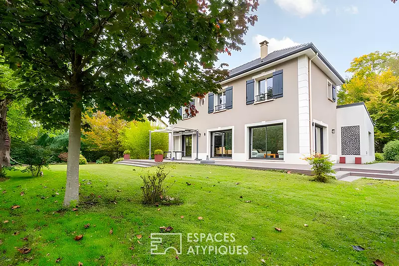 Située au coeur du quartier des Arbres, le secteur le plus prisé de Montfermeil, cette demeure d'architecte signée Berval, construite en 2013, déploie 330 m² utiles dont 209 m² habitables. Elle profite d'un cadre privilégié, en bout d'impasse, sur un terrain paysager de 1 423 m² bordé par la forêt. Construite selon les normes BBC RT 2012, la maison bénéficie de prestations techniques soignées : chauffage au gaz basse température, aspiration centralisée, adoucisseur d'eau, osmoseur à triple filtration et bornes extérieures de recharge pour véhicules électriques. Dès l'entrée, les volumes et la lumière sont au rendez-vous. Le hall dessert une cuisine dînatoire conviviale, prolongée par un cellier attenant. Une verrière contemporaine révèle la perspective d'un vaste double séjour de 47 m² baigné de lumière, rythmé par quatre grandes baies vitrées coulissantes. Celles-ci ouvrent sur la terrasse puis le jardin et invitent la nature à l'intérieur, offrant une sensation de quiétude et d'espace. Le rez-de-chaussée propose également une chambre agrémentée d'un dressing mural, une salle d'eau avec rangements intégrés, un bureau, un vestibule ainsi qu'un toilette indépendant. A l'étage, un palier avec placard et un long couloir distribuent quatre chambres dotées chacune de dressing, ainsi qu'une spacieuse salle de bains avec douche et toilettes indépendants. Le sous-sol de 125 m² complète cette propriété avec une vaste buanderie / chaufferie, une cave, un studio indépendant avec salle d'eau et un garage triple pouvant accueillir jusqu'à trois véhicules. Un appentis carrelé de 20 m² avec charpente en bois enrichi cet ensemble : il pourra selon les envies devenir un bureau, un atelier d'artiste, un espace bien-être ou un spa. Une adresse rare, où l'architecture contemporaine, la sérénité du lieu et la proximité de la nature composent une harmonie de vie familiale des plus agréable. CLASSE ENERGIE : C CLASSE CLIMAT : C Montant moyen estimé des dépenses annuelles d'énergie pour un usage standard, établi à partir des prix de l'année 2021 entre 1 180 euros et 1 660 euros. Bus 604 à 400 m Bus 643 à 700 m Les informations sur les risques auxquels ce bien est exposé sont disponibles sur le site Géorisques : https://www.georisques.gouv.fr Contact : Nathalie 06 18 77 30 26 RSAC : 908 437 460 Bobigny Nathalie GUILLOT (EI) Agent Commercial - Numéro RSAC : 908437460 - Bobigny.