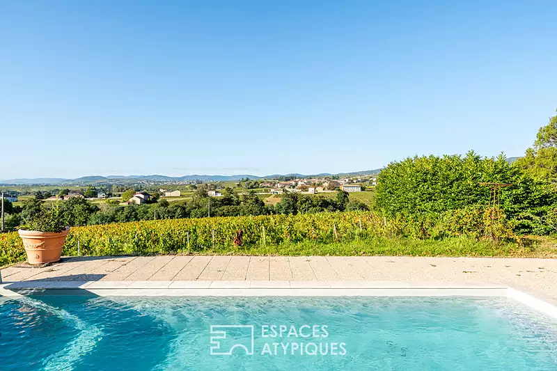Sur les hauteurs de Fleurie, au coeur d'un hameau préservé, cette ancienne dépendance d'une propriété bourgeoise offre de beaux volumes répartis sur deux niveaux. D'une superficie généreuse, elle comprend cinq chambres ainsi qu'un vaste séjour à la hauteur sous plafond remarquable, baigné de lumière grâce à de larges ouvertures orientées Est-Sud, offrant une vue imprenable. L'organisation intérieure se distingue par sa pièce de vie conviviale, animée par un poêle cheminée central, véritable pivot de l'espace. Les matériaux bruts et la rénovation globale confèrent une atmosphère chaleureuse, tandis que la cuisine ouverte, prolongée par une arrière-cuisine, s'intègre parfaitement à l'ensemble. Des sanitaires complètent ce niveau. A l'étage, le dégagement dessert cinq chambres, dont une suite parentale avec dressing et salle d'eau. Une seconde salle d'eau et un WC indépendant complètent l'espace nuit. Les extérieurs révèlent tout le caractère unique de cette maison. La piscine traditionnelle, idéalement orientée, profite d'une vue imprenable sur les coteaux du Beaujolais et sur un paysage sans aucun vis-à-vis. Un ancien four à pain subsiste dans les dépendances, témoin de l'histoire du lieu et apportant une touche authentique. Le jardin, bordé de vignes, confère une atmosphère paisible, propice à la détente et à la convivialité, tandis que les vestiges de l'ancienne orangerie enrichissent la façade d'un caractère singulier. La propriété est équipée d'une pompe à chaleur, garantissant un confort moderne et une meilleure performance énergétique. Cet ensemble rare séduit par sa situation privilégiée, son calme absolu et ses perspectives d'aménagement. Alliant charme ancien et potentiel de transformation, il incarne parfaitement l'esprit d'un bien atypique dans le Beaujolais. CLASSE ENERGIE : D / CLASSE CLIMAT : B. Montant moyen estimé des dépenses annuelles d'énergie pour un usage standard, indexées aux années 2021, 2022, 2023 : entre 2100 euros et 3200 euros (abonnement compris) Contact : Héloïse - 06 68 44 82 46 Héloïse Restier (EI) Agent Commercial - Numéro RSAC : - .