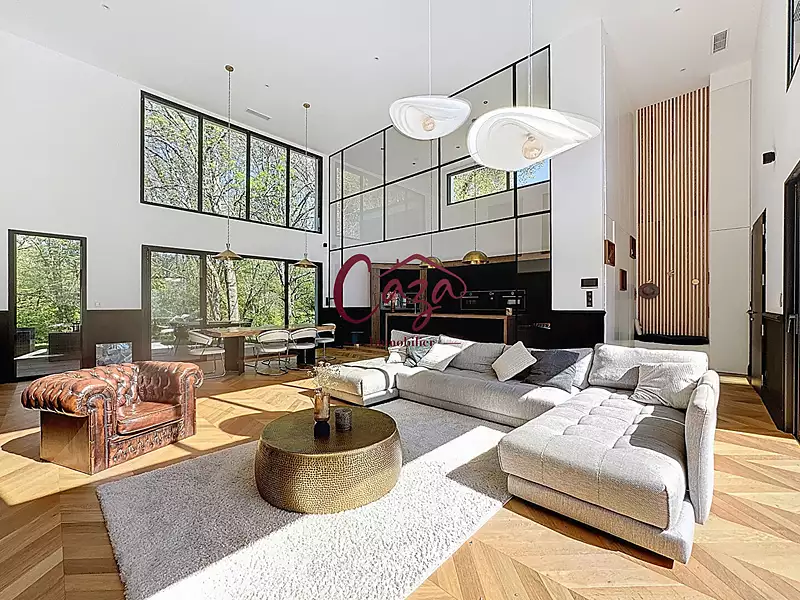 L'agence CAZA Immobilier vous présente en EXCLUSIVITE A 10 minutes de Bordeaux centre Villa de standing , aux prestations haut de gamme et à la décoration soignée située sur les hauteurs de Bouliac en immersion dans la forêt, dans un beau lotissement récent. Sur une belle parcelle paysagée d'environ 928 m2, elle dispose d'un espace habitable totale de 210 m2 et d'un garage isolé d'environ 22 m2 La villa offre un double environnement ; côté sud un espace piscine et côté nord une terrasse en bois exotique donnant sur un parc boisé. En rez de chaussée : belle entrée généreuse donnant sur une très agréable pièce à vivre baignée de lumière avec une hauteur de plafond unique La pièce dispose d'une cuisine haut de gamme avec un équipement complet. Dans la continuité des espaces de vie, on découvre une chambre indépendante de plus de 15 m2 avec sa salle d'eau , ainsi qu'une très belle suite parentale d'environ 40 m2 , avec son grand dressing et sa salle d'eau. A l'étage : beau pallier donnant accès à deux grandes chambres , un espace cellier/buanderie , et une salle de bains. La parcelle joliment arborée et paysagée dispose de deux terrasses en bois exotique , d'un garage non attenant d'une surface d'environ 22m2 ainsi qu'une belle piscine de belles dimension avec rideau immergé. Pour plus de renseignements sur cette maison l'équipe CAZA immobilier est à votre disposition par mail ou téléphone