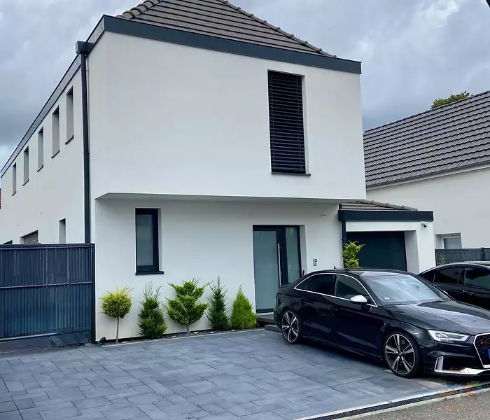 Cette maison de 2019 contemporaine aux prestations haut de gamme, offre 210 m² habitables.