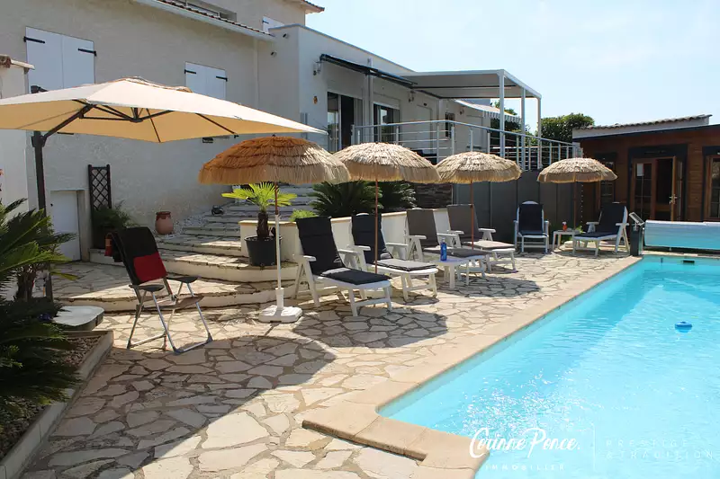 A l'abri des regards, avec une belle vue et nichée au pied du charmant village de Lédenon, l'Agence Corinne Ponce Immobilier vous propose cette superbe villa familiale de 210M2 où règnent détente et sérénité. Dès l'entrée on découvre le majestueux salon agrémenté de sa spacieuse cuisine entièrement équipée et accèdant directement à la terrasse de 70M2 avec sa pergola bioclimatique. Trois suites parentales disposant de leur douche à l'italienne et de leur WC privés se prêtent éventuellement à une location en chambres d'hôtes avec un accès privé et indépendant. Deux autres chambres, une salle de bain et un WC complètent ce bien au rez de chaussée. L'étage dessert une suite parentale avec sa salle d'eau et sa terrasse privative. Le jardin agréablement aménagé avec goût où s'intègrent le SPA et le sauna autour de la piscine de 10x4.5m avec son pool house est une invitation à la détente et à la relaxation. Tout le matériel de massage est à votre disposition! A voir absolument!!