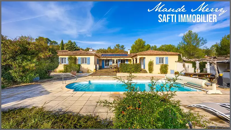 A proximité du centre du charmant village de Néoules, venez visiter cette jolie villa entièrement de plain-pied d'une surface totale d'environ 210 m2 composée de deux logements bien distincts avec piscine et garage, le tout édifié sur une belle parcelle de terrain entièrement plate et clôturée de 2500 m2.