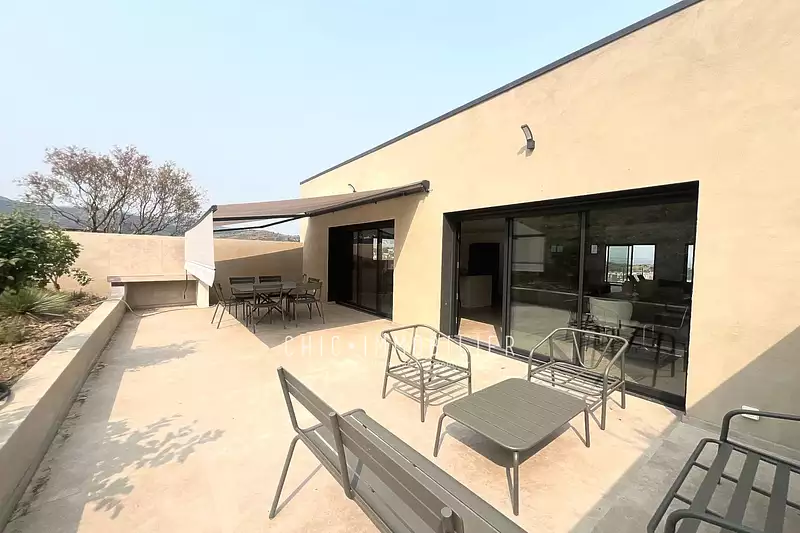 La propriété possède également 3 terrasses avec vue imprenable sur la mer, un jardin de 250 m² qui comprend un système d'arrosage automatique, et un parking. Parmi les équipements de confort, on compte un système de chauffage par climatisation réversible, de l'eau chauffée thermodynamiquement, des fenêtres à double vitrage ainsi qu'un jacuzzi spa.