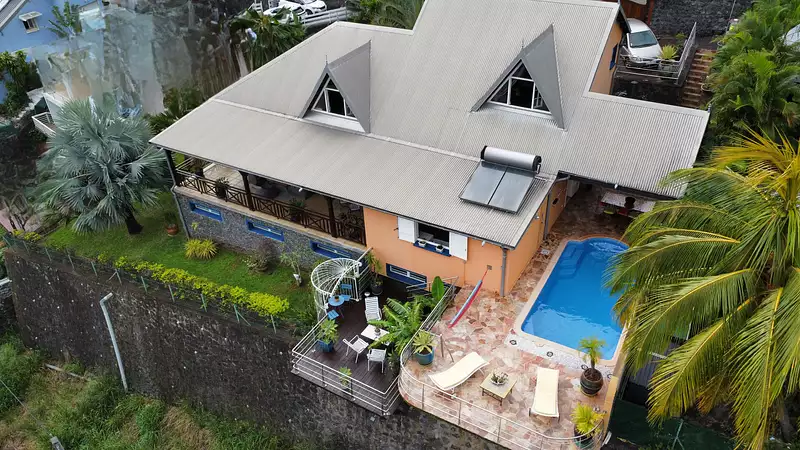 Premium Immobilier vous présente à la vente à Saint-Denis BELLEPIERRE, proche du CHU, cette jolie villa T5/6 d'environs 210m2 de surface habitable implantée sur un terrain de 815 m2 clôturé, avec un grand garage avec buanderie et rangements. Située en fond d'un lotissement prisée et discret, vous apprécierez le calme et le bon voisinage. La maison à vendre comprend : Un séjour spacieux prolongé par la première terrasse couverte vue mer et montagne, une cuisine aménagée ouverte donnant également sur la terrasse principale, trois grandes suites, ainsi que des wc également à chaque niveau. Une grande mezzanine aménagée en bureau surplombe le séjour et la cuisine. Chaque détails est pensés et réalisés par des compagnons de France au savoir faire incontournable. L'architecture de cette maison est unique du fait de ses matériaux nobles comme la charpente tropicale, la toiture japonaise de l'entrée à la maison, sa toiture avec gouttières en zinc, plafonds créoles et de nombreuses surprises lors d'une visite. La piscine est une monocoque de Sunset au sel, chauffe eau solaire. Les plus : - trois chambres possèdent leur propre salle d'eau et wc. - Cuisine de bonne qualité en bois. - possibilité d'aménager le grand garage pour y faire un appartement indépendant. - portail et porte de garage automatique Premium Immobilier - vente - Maison - Saint-Denis - Bellepierre - Ile de La Réunion Les informations sur les risques auxquels ce bien est exposé sont disponibles sur le site Géorisques : www.georisques.gouv.fr. (3.80 % honoraires TTC à la charge de l'acquéreur.) Franck MOUNOUSSAMY-DARCEL (EI) Agent Commercial - Numéro RSAC : 82063990400037 - Saint-Denis.