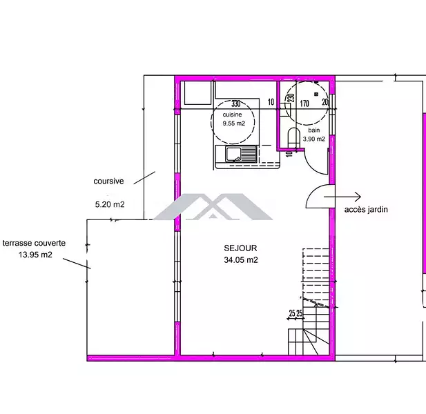 Elle est construite sur deux niveaux, au rez-de-chaussée séjour cuisine d'environ 45 m² ouverte sur une terrasse d'environ 13 m². La salle de bains est également prévu.
