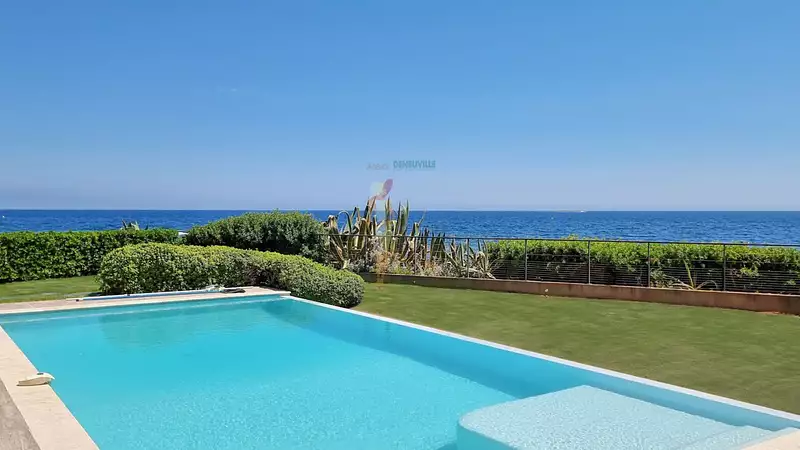 A vendre, aux Issambres. Superbe villa pied dans l'eau offrant une vue panoramique sur la mer face à Saint Tropez et un accès direct à la plage. Cette propriété de prestige profite d'un terrain de 1 600 m² entièrement plat avec pelouse véritable et piscine à débordement 10x5 chauffée avec pool house. D'une superficie de 211 m², la villa se compose d'une entrée, d'un salon, d'une salle à manger ouvrant sur terrasse couverte avec pergola bioclimatique, de 5 grandes chambres dont 3 en suite, d'une salle d'eau, de 6 wc japonais et d'une buanderie. Villa entièrement climatisée. Un véritable havre de paix.