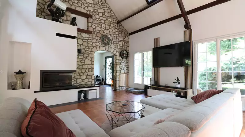 Dès l’entrée, le regard se porte sur le VASTE SALON CATHÉDRALE, BAIGNÉ DE LUMIÈRE et prolongé par une salle à manger et une cuisine semi-ouverte tournée vers le jardin et la piscine. La CHEMINÉE MODERNE, SUR MESURE, apporte une note chaleureuse et contemporaine à l’ensemble.