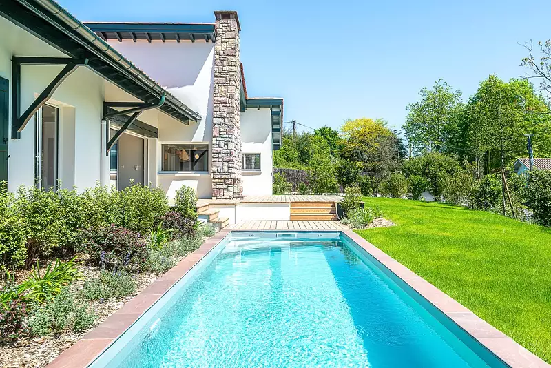 A l'extérieur, vous profiterez d'un beau jardin paysagé de plus de 1 700 m2, de terrasses plein sud et d'une piscine chauffée.