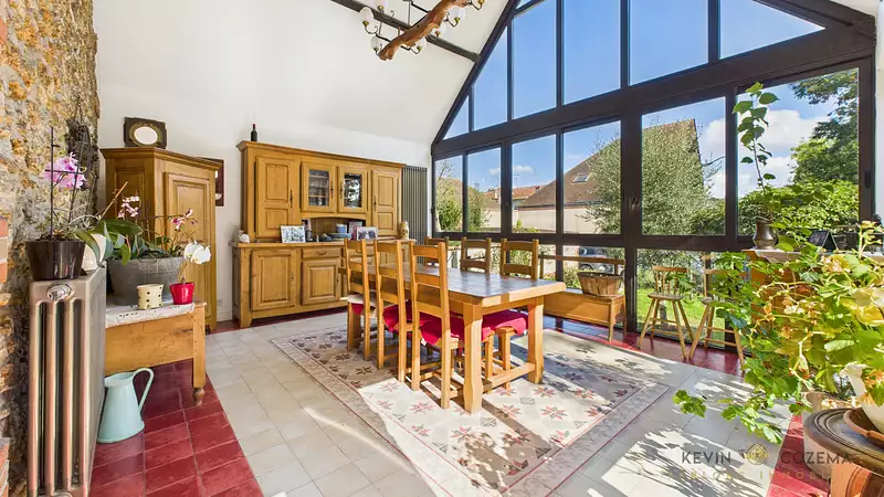 Dès l’entrée, le charme opère : les volumes généreux créent une atmosphère unique et chaleureuse. Le double séjour lumineux et sa verrière apportent une touche contemporaine parfaitement intégrée à l’esprit de la maison. La cuisine aménagée, véritable cœur de la bâtisse, séduit par son piano de cuisson ancien. Dans son prolongement, découvrez une salle à manger unique avec son impressionnante hauteur sous plafond (+ de 5 mètres), ses deux côtés entièrement vitrés et son accès direct au jardin.
