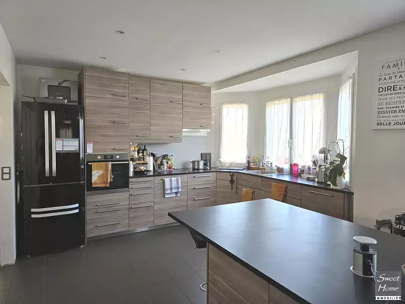 Maison individuelle sur terrain clos 665 m² comprenant en rez-de-jardin : entrée, cuisine équipée, séjour, deux chambres, salle d'eau, toilettes, buanderie et chaufferie. A l'étage : entrée, cuisine contemporaine équipée ouverte sur le séjour, véranda, trois chambres, salle d'eau, toilettes. Au 2ème niveau : une chambre, bureau, salle d'eau.