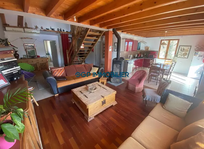A l'étage, un espace séjour avec coin cuisine ouvert sur mezzanine de 50 m², un espace nuit avec une grande chambre de 16m², une salle de bains de 11m² et son WC indépendant.