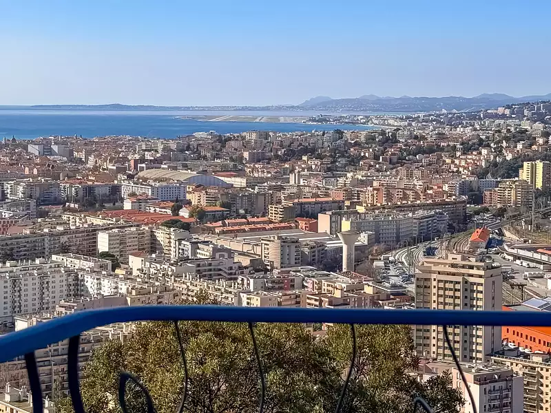 Nichée sur un terrain de 3 600 m², à l'abri des regards, elle bénéficie d’une vue panoramique à 360°, donnant sur la mer, le château, la ville de Nice et les montagnes.
