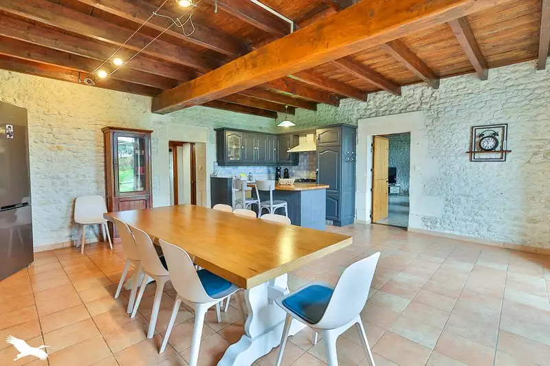 Environnement campagne à 7min de JONZAC, maison charentaise composée d'une spacieuse salle à manger ouverte sur cuisine aménagée, salon avec cheminée, deux chambres, salle d'eau/wc. A l'étage, palier (39 m²) pouvant se transformer en chambre, une chambre, salle de bains, wc. A l'extérieur, jardin 670 m² avec garage double et préau.