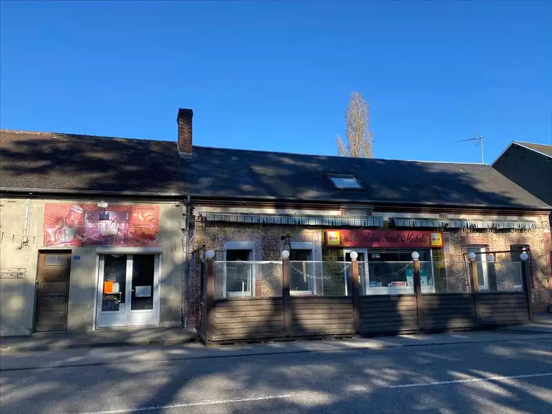 Immeuble en pierres et briques, couv. ardoises, comprenant:COMMERCE au RDC:- une grande salle avec bar et cheminée, salle, cuisine, salle 'plonge', salle de vente avec terminal de cuisson, réserve, wc avec lavabo.DPE viergeHABITATION au 1er étage:- séjour-salon, 3 chambres, pièce, salle de bain avec wc.DPE: E278, B9. Coût estimé entre 1710€ et 2340€3 CAVESChauffage électriqueRaccordée au tout à l'égoutTerrain 3086m².