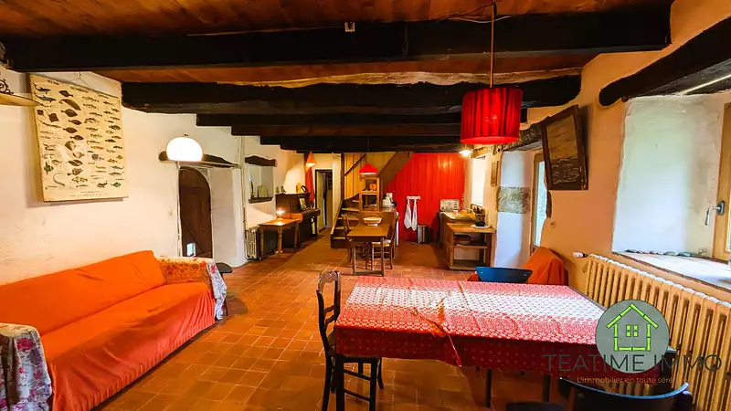 La première longère offre deux chambres de 22 et 26m² au sol, une pièce à vivre avec cheminée (excellent tirage et trappe isolante), prolongée d'une cuisine semi-ouverte, le tout de 34m², une salle séjour de 25m², un espace buanderie, une salle de bain avec WC, une annexe aménageable de 7m². Vous apprécierez les traditionnelles tommettes ocres. Le chauffage central poêle à granulés, de haute performance, avec radiateurs en fonte, apporte le confort récent au charme traditionnel.