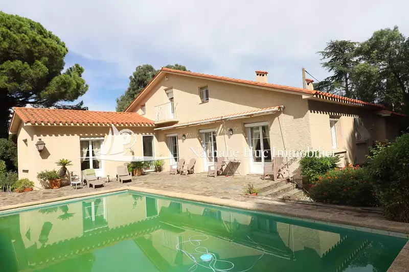 CABESTANY - Au c½ur du village très belle maison cossue en 4 faces, d'une surface habitable de 215 m2 sur un parc arboré de 2000 m2. De plain-pied, une belle entrée lumineuse, une salle de séjour avec cheminée, une cuisine indépendante équipée, un coin dînatoire . Un bureau , 3 chambres dont une suite parentale avec douche, une salle d'eau. A l'étage, un dégagement, une pièce mansardée aménagée en bureau ou chambre, une salle d'eau, un wc séparé, un dressing. Garage, parkings, terrasse, forage, piscine 5x10 , parc arboré au calme et sans vis à vis .