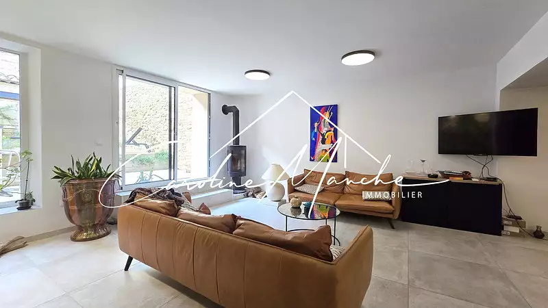 Rénovée avec goût, la maison mêle matériaux anciens (pierre, bois), touches contemporaines (acier, volumes ouverts, lumière) et modernité (domotique, climatisation à tous les niveaux).