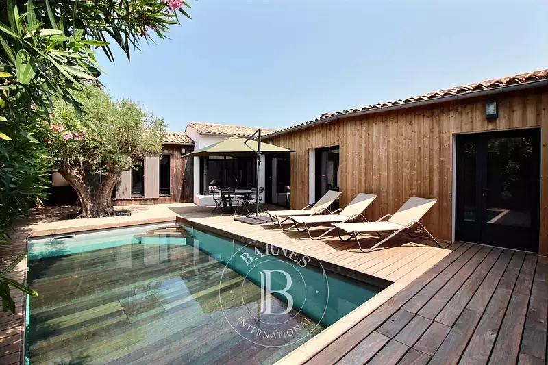 À 2 pas de la plage, maison de 215 m2 habitables environ composée d'une partie principale et d'une maison d'amis. La partie principale se compose d'une entrée, un séjour avec cuisine ouverte, cellier et un salon tv. 3 chambres avec 3 salles d'eau. Patio, terrasse avec piscine à plancher mobile, sauna et garage. La maison d'amis offre 2 chambres supplémentaires avec chacune leur salle d'eau. Un séjour avec une cuisine ouverte et un patio. Cour d'accueil pour stationner les véhicules.