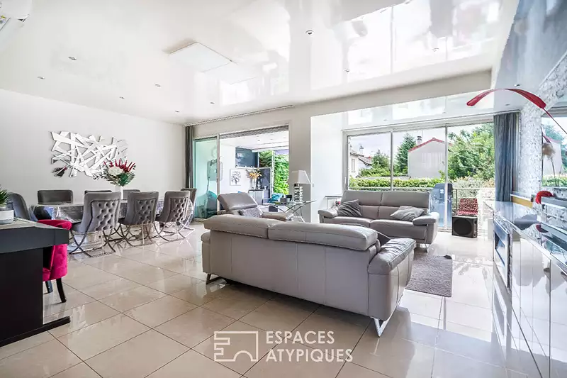 Cette maison d'architecture contemporaine, construite en 2007, est idéalement située dans le quartier résidentiel et prisé de La Basoche, en plein coeur des Pavillons-sous-Bois. Elle développe 215m² habitables (241m² au sol), répartis sur trois niveaux, sur une parcelle paysagée de 301m² agrémentée d'une piscine hors-sol. Au rez-de-chaussée, un vaste dégagement, sublimé par une belle hauteur sous plafond, mène à un double séjour aux volumes généreux ainsi qu'à une cuisine semi-ouverte. La pièce de réception, baignée de lumière grâce à ses majestueux ouvrants, est prolongée d'une terrasse couverte ainsi que d'un balcon. En contrebas, le jardin paysager accueille une seconde terrasse et la piscine, le tout discrètement nichée dans un écrin de verdure à l'abri des regards. A l'étage, un palier pouvant être aménagé en bureau dessert l'espace nuit où prennent place une suite parentale avec dressing et salle de bains avec douche ainsi que deux autres chambres avec salle d'eau privative. Un WC indépendant complète ce niveau. Le rez-de-jardin accueille une chambre baignée de lumière, ouverte sur le jardin par une large baie vitrée ainsi qu'une salle d'eau. Un bureau, pouvant servir de chambre d'appoint, complète cet espace. Des toilettes indépendantes, une buanderie, une pièce de rangement et un garage complètent ce niveau. Ce bien familial, idéalement situé, offre de beaux volumes, aussi bien dans la pièce de vie que dans les chambres. Il dispose de nombreux espaces de rangement et de tout le confort moderne : pompe à chaleur, ballon d'eau chaude thermodynamique, ainsi que la climatisation dans l'ensemble des pièces. Groupe scolaire l'Alliance : à 3 minutes à pied T4 : à 4 minutes CLASSE ENERGIE : C / CLASSE CLIMAT : C Montant moyen estimé des dépenses annuelles d'énergie pour un usage standard, indexées aux années 2021, 2022, 2023: entre 2 380 euros et 3 270 euros (abonnement compris) Les informations sur les risques auxquels ce bien est exposé sont disponibles sur le site Géorisques : https://www.georisques.gouv.fr Contact : Nathalie 06 18 77 30 26 RSAC : 908 437 460 Bobigny Nathalie GUILLOT (EI) Agent Commercial - Numéro RSAC : 908437460 - Bobigny.