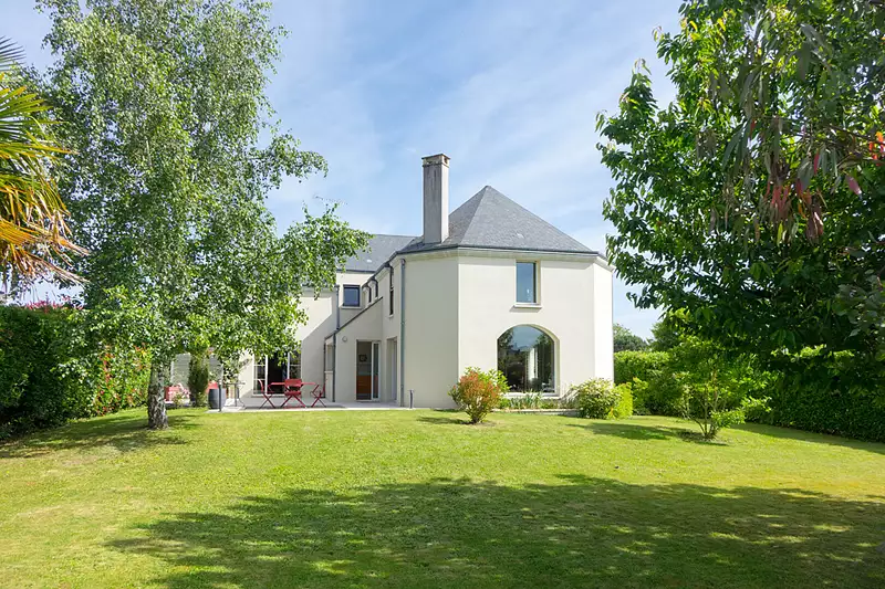 Immo de Loire vous présente en exclusivité une maison d'architecte de 215 m² habitables aux prestations et matériaux de qualité. Au rez de chaussée, la visite commence par une confortable entrée de 18 m² équipée d'une penderie sur mesure. Un salon-salle à manger en L de 40 m² avec poêle à bois, baigné de lumière grâce à ses grandes ouvertures modernes sur 3 cotés de la maison , ce qui permet un accès direct à la terrasse de 50 m² en pierre naturelle "travertin" et à son agréable jardin paysagé exposé au sud. Attenant à cette pièce de vie , la cuisine d'une surface de 18 m² ouverte ou fermée par des portes à galandage. Au centre un îlot , véritable coeur de la cuisine , offre un coin repas convivial. Un dégagement permet d'accéder à un wc indépendant avec lave main, on y retrouve également une chambre de 11 m² avec placard et une deuxième chambre de 21 m² pouvant être utilisée comme bureau ou chambre avec une très belle vue directe sur le jardin, un escalier privatif permet d'accéder à une pièce mezzanine de 11 m² , parfait pour le télétravail. L'accès à l'étage se fait par bel escalier en pierre : celui ci nous amène sur un nouvel espace/mezzanine de 11 m² donnant accès à 4 belles chambres ( de 12,5 à 18,5 m²) dont 1 avec un dressing privatif , climatisation et un accès direct à la salle de bain, une salle d'eau , un wc indépendant. Un sous sol de 112 m2 vient compléter les prestations de la maison avec une cave à vin, et un garage 2 à 3 voitures L'ensemble est situé sur un beau terrain clos, paysagé, arboré et sans vis à vis de 1200 m² Chauffage au sol au rez -de -chaussée ( Gaz de ville) Parquets en chêne et portes intérieures en bois massif. Cuisine LEITCH équipée, avec un plan de travail en pierre. Poêle à bois. Portail électrique en alu , Visiophone. Terrasse de 50 m² en pierre naturelle "Travertin" et Bois Ipé Triple exposition : Sud , Est et Ouest. Climatisation dans la chambre N°6 Bonne isolation thermique. Possibilité de faire installer une piscine. Zone non inondable. Estimation des coûts annuels d'énergie du logement: Entre 1650 euros et 2 280 euros par an Prix moyens des énergies indexés au 1er janvier 2021 (abonnements compris) Venez visiter ce bien d'exception avec votre conseiller Immo de Loire Honoraires de 5% à la charge de l'acquéreur. (4.94 % honoraires TTC à la charge de l'acquéreur.)