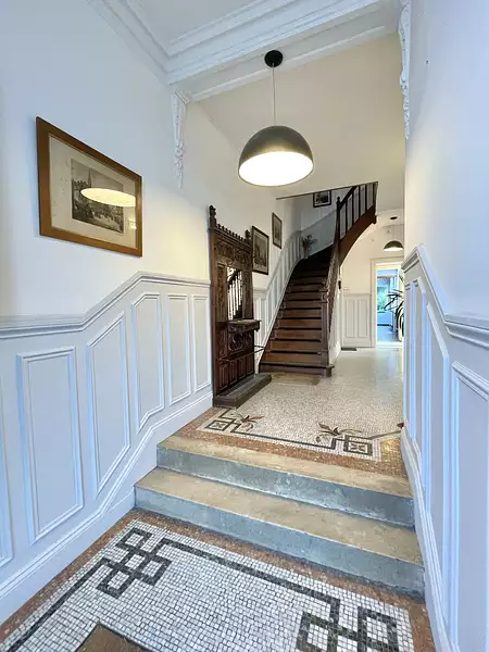 L'entrée bien conservée nous rappelle l'époque Art déco et nous mène vers salon/salle à manger avec parquets bien entretenus, cheminées (dont une fonctionnelle) et hauteur sous plafond de 3m20.