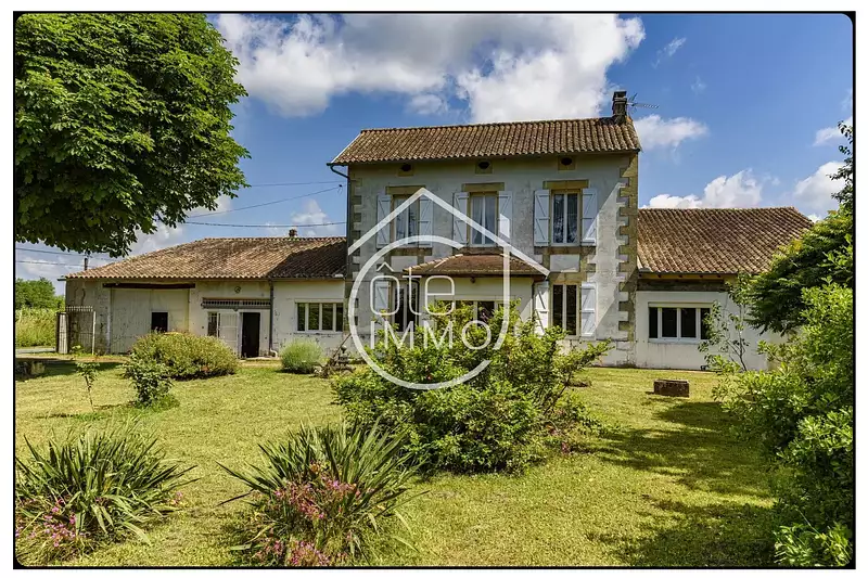 Coté Immo Pays Foyen vous invite à découvrir cette belle maison ancienne pleine de cachet, d’une surface généreuse de 216 m², avec dépendances, garage et grand jardin arboré de plus de 3 200 m².
