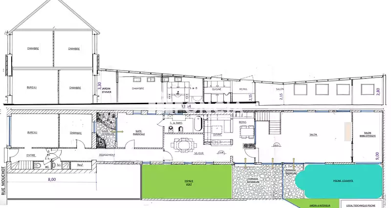 En rez-de-chaussée, la maison se compose d'une entrée, bureau, jardin d'hiver, quatre chambres dont une avec salle de bain, cuisine, salon-séjour avec accès sur la terrasse extérieure avec piscine.
