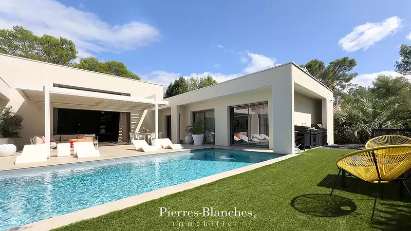 PIERRES-BLANCHES IMMOBILIER - L'EXPRESSION DU LUXE Montpellier Nord - PBI Collection C'est au cœur d'un village languedocien, lové entre garrigue et vignes, sous la silhouette majestueuse du Pic Saint-Loup, que s'élève cette propriété contemporaine de 215 m². Son architecture pure, sobre et raffinée, s'inscrit avec justesse dans le paysage méditerranéen, mêlant modernité et authenticité. Implantée dans un quartier résidentiel paisible, cette demeure de plain-pied a été pensée pour incarner la sérénité et l'harmonie. Chaque espace, chaque ligne, chaque ouverture semble dialoguer avec la lumière du Sud. Dès l'entrée, le vestibule impose sa sobriété élégante et nous conduit vers une vaste pièce de réception baignée de clarté. La hauteur sous plafond, véritable atout architectural, confère à l'ensemble une impression d'amplitude et de légèreté. Le salon, propice aux instants de partage, se prolonge naturellement vers la salle à manger, où une table sculpturale en bois massif trône telle une œuvre d'art. Dans sa continuité, la cuisine ouverte, ingénieuse et raffinée, se transforme à souhait en espace indépendant, conjuguant esthétisme et fonctionnalité. Côté nuit, la suite principale offre un véritable cocon : salle d'eau, dressing et accès direct aux terrasses et au jardin. L'autre aile de la maison abrite trois chambres supplémentaires avec rangements, autour d'une salle d'eau centrale, parfaite pour accueillir famille et invités. À l'extérieur, le jardin paysagé se déploie tel un belvédère naturel face au Pic Saint-Loup. Les terrasses, d'environ 300 m², multiplient les espaces de détente coins lounge, solarium, pergolas pour vivre pleinement chaque heure du jour. Au centre, la piscine de 8 mètres, enveloppée d'essences aux reflets émeraude, invite à la sérénité et aux plaisirs de l'été retrouvé. Quand vient le printemps, la végétation dessine son ombre bienfaitrice et le murmure du vent dans les feuilles devient la seule rumeur du monde. Le Plus : Pompe à chaleur - abri véhicules équipé d'une borne de recharge - à 6 minutes des commerces, des écoles, des centres médicaux et des transports. Notre Avis - Gemme Éternelle® Née d'un écosystème préservé, cette demeure à l'architecture rigoureuse et inspirée célèbre la rencontre du contemporain et du patrimonial. Une création rare, équilibrée et intemporelle une véritable gemme méditerranéenne, taillée dans la lumière. "Une Vision Authentique et Contemporaine de l'Immobilier de Luxe." Franck Ballester ® TOUTE INSPIRATION, MODIFICATION, REPRODUCTION EST INTERDIT - REGISTERED TRADEMARK Dossier sur références Contact +33 (0)4 67 70 07 87
