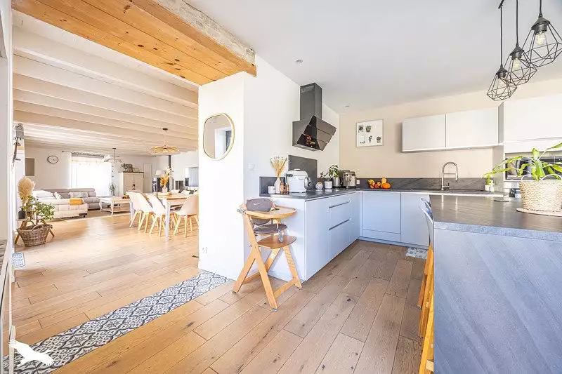 Belle longère rénovée avec goût, comprenant au rez de chaussée, une belle pièce de vie, cuisine équipée, buanderie, une chambre parentale avec dressing, SDE et wc. L'étage vous offre 3 grandes chambres, dressing, dégagement avec rangement, une SDB et un wc. Grenier aménagé. Grand garage, dépendance et chai . Coup de coeur assuré!