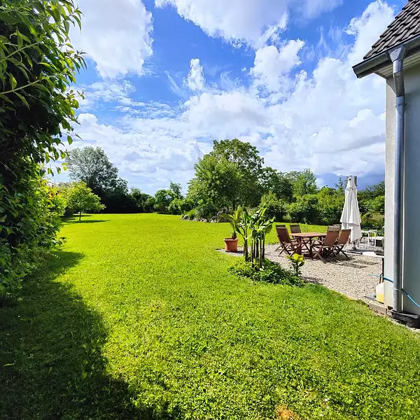 Magnifique villa à Hésingue sur 12 ares arborés, très lumineuse avec prestations de standing, proche de la frontière Suisse et des commerces, piscinable.