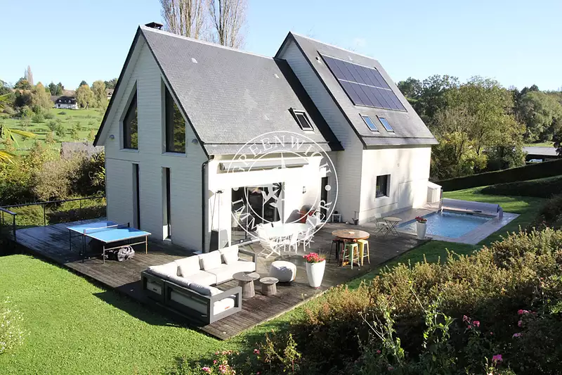 A 5 km de la plage d'HOULGATE, dans un environnement exceptionnel et vallonné, une Villa contemporaine de 6 PP sur sous-sol, comprenant un hall d'entrée, une double salle de réception avec cheminée donnant sur grande terrasse avec piscine, une grande cuisine aménagée équipée, une chambre avec salle de bains, un wc, à l'étage: une mezzanine, deux chambres, une salle de bains, wc, en rdj une chambre avec salle de douche, wc, une buanderie, une cave, et deux emplacements de voitures. Un parc de 4200 m2 planté et arboré. RARE A LE VENTE ...!!!! (4.95 % honoraires TTC à la charge de l'acquéreur.)