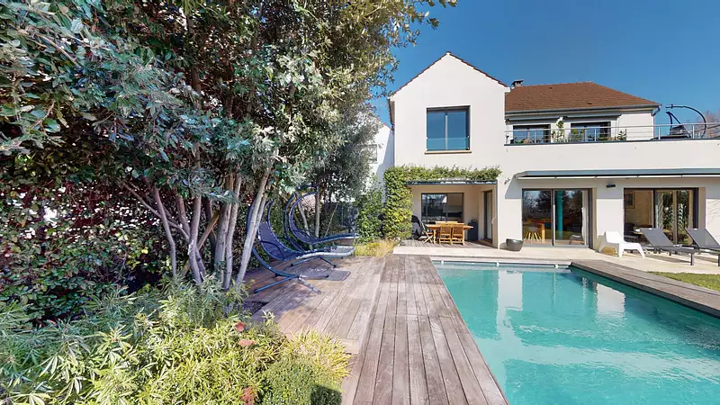 EXCLUSIVITE : Crespières Maison récente, où il règne comme un air de vacances toute l'année. Ce bien est situé au coeur d'un domaine sécurisé, en centre village, à deux pas des écoles et commerces de proximité. Très bon plan qui fait la part belle aux espaces de rangements et pièces de services. Vaste séjour avec poêle à granulés, exposé sud et ouvrant sur de belles terrasses en bois, le jardin clos et la piscine. Idéale pour une vie de famille, la maison propose 7 chambres. La décoration est élégante, les matériaux de qualité. Ce bien d'un grand confort comme en témoigne son magnifique DPE en C, sera un véritable cocon douillet été comme hiver. (4.55 % honoraires TTC à la charge de l'acquéreur.)