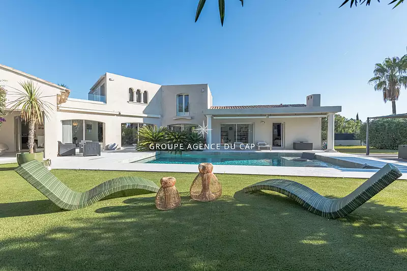 Exclusivité Valescure, Superbe villa lumineuse dans secteur calme très recherché, entièrement rénovée offrant de très beaux volumes et de très belles prestations. Salon, salle à manger avec cuisine ouverte, 4 chambres en suite dont 2 de plain pied, garage double, bureau, salle de jeux. Piscine à débordement. Climatisation.