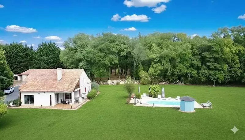 Tourtoirac 24390. Prix 374 000 euros Honoraires agence inclus ( dont 4%ttc à la charge de l'acquéreur, soit 360 000 euros hors agence). Maison contemporaine , lumineuse et fonctionnelle, 220m² habitables environ, composée d'une grande entrée, une pièce de vie de 46m², composée d'une cuisine us équipée, coin repas, salon avec cheminée, séjour 44m², 2 chambres en rdc avec leur salle d'eau privative chacune (24.50/20.80m²), buanderie/chaufferie, toilettes; belle mezzanine 30m² (coin bureau, coin détente), 2 chambres à l'étage (dont 1 avec salle d'eau privative 20.15m² et la 2éme avec lavabo 16m². Deux terrasses dont une couverte. Un garage double de 38m², un atelier de 20m², une cave, un 2ème garage ou abri de jardin 15m², un appentis pour camping-car. Beau terrain plat et entièrement clôturé (constructible) de plus de 1hectare et 3720m² de bois (très bien entretenu). Piscine 10x5 (le liner est neuf), dans un environnement très calme et très agréable, sans vis à vis; à 5 minutes des commerces.