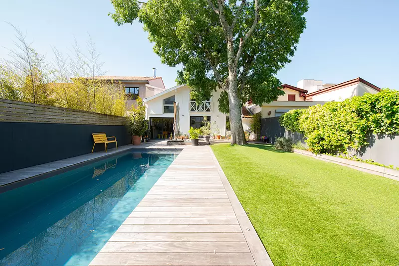 Bordeaux Caudéran, située dans un environnement privilégié à proximité immédiate du Parc Bordelais, cette maison d'architecte d'environ 196 m², entièrement rénovée en 2017, séduit par l'élégance de ses lignes contemporaines et la générosité de ses volumes, conférant une sensation d'espace et de lumière remarquable. Dès l'entrée, un jardin d'accueil paysager avec stationnement privatif crée une atmosphère intime et apaisée, en retrait de rue. Le rez-de-chaussée s'organise autour d'une distribution fluide : une entrée discrète avec dressing mène à une suite parentale indépendante avec salle d'eau et WC, implantée à l'avant de la maison. A l'arrière, les volumes s'ouvrent pleinement sur le jardin grâce à une vaste pièce de vie baignée de lumière. La hauteur sous plafond, les poutres apparentes et les lignes épurées mettent en valeur un espace de réception chaleureux, structuré autour d'un poêle à bois. La cuisine ouverte, moderne et fonctionnelle, prolonge cet ensemble convivial, complété par un cellier/buanderie, des WC séparés, une cave et un garage intégré. A l'étage, l'architecture valorise l'espace par un jeu de volumes ouverts : une vaste mezzanine aménagée en salle de jeux distribue trois chambres ainsi qu'une salle de bains avec WC. Chaque espace bénéficie de proportions équilibrées et d'une atmosphère cosy sous toiture. Le jardin paysager, prolongé par une piscine, conduit à une dépendance de 25 m² parfaitement intégrée, abritant deux chambres supplémentaires et une salle d'eau. Cet espace annexe, idéal pour recevoir ou aménager un bureau, complète harmonieusement l'ensemble. Ce bien rare allie qualité architecturale, volumes généreux et cadre de vie recherché, à quelques pas des écoles, commerces et du poumon vert du quartier.