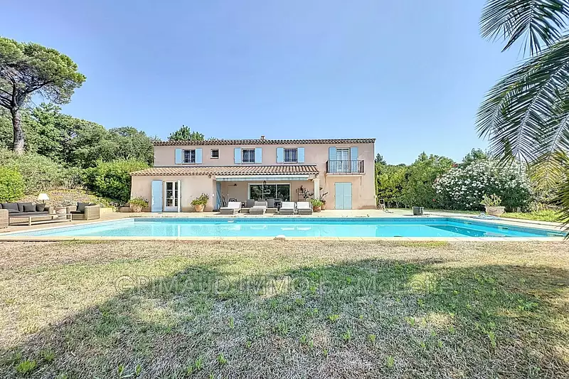 Située dans un quartier paisible de la campagne de Grimaud, cette charmante villa individuelle de 250 m², exposée sud-ouest, vous offre une vue dégagée. Elle est érigée sur 2 niveaux, avec un jardin de 2957m², et comporte: hall d'entrée, séjour avec cheminée, salle à manger, sa cuisine indépendante et son cellier, une chambre de maitre avec sa salle de bain et à l'étage se trouve les 3 chambres avec ses salles de bains douches. Une belle piscine chauffée de 14m. Cette demeure, de bonne qualité, construite en 2012, est également équipée d'une alarme, d'un arrosage automatique, d'un portail automatique et de double vitrage. Belles prestations