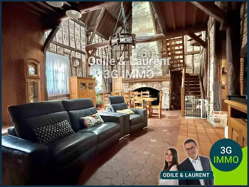 Dès l'entrée, vous serez séduit par le volume et le caractère du salon-séjour : cheminée monumentale avec poêle à bois, belle hauteur sous plafond, colombages, briques et moellons. Une ambiance authentique et chaleureuse.