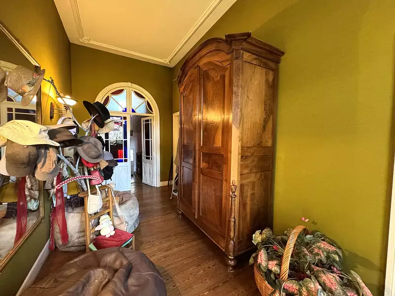 Dès l'entrée, cette maison de maître impressionne par son cachet d'origine, avec ses magnifiques parquets, sa belle hauteur sous plafond et ses moulures raffinées. Les grandes ouvertures inondent les pièces de lumière naturelle, mettant en valeur la noblesse des matériaux et l'élégance intemporelle du lieu. Le vaste salon, agrémenté d'un poêle à bois, s'ouvre sur une terrasse surplombant le parc, créant une parfaite harmonie entre intérieur et extérieur. La salle à manger et la cuisine, dotée d'une cheminée, offrent un cadre chaleureux et convivial, idéal pour recevoir.