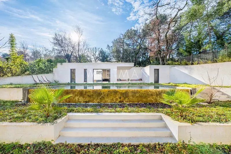 Le jardin, conçu pour garantir intimité et sérénité, sublime l’architecture raffinée de la villa. La maison d’amis avec son pool house, comprenant une chambre avec salle de bain attenante, s’intègre parfaitement dans ce cadre verdoyant.