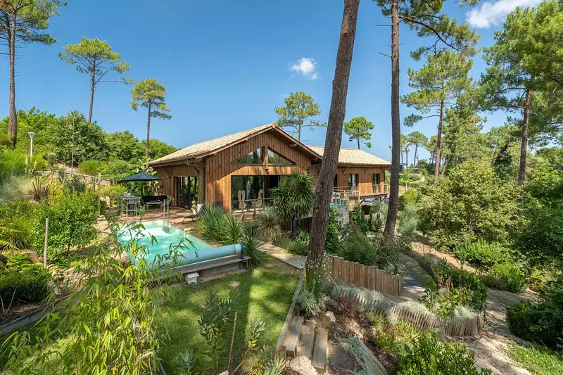 Située dans un cadre privilégié au cœur du Golf de Biscarrosse, cette villa contemporaine de 2021 offre des prestations haut de gamme sur une parcelle arborée de 1 289 m², sans aucun vis-à-vis.