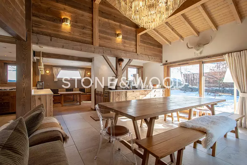 Entièrement rénové en 2022 (isolation, plomberie, électricité, huisseries, toiture...), il offre un confort optimal et des prestations modernes. Mêlant l'authenticité du vieux bois au design contemporain, ses 223 m2 de surface plancher comprennent une vaste pièce de vie ouverte prolongée par une grande terrasse avec vue dégagée sur les montagnes. Celle-ci se compose d'un salon avec cheminée, d'une cuisine entièrement équipée, d'une salle à manger et d'un coin repas.