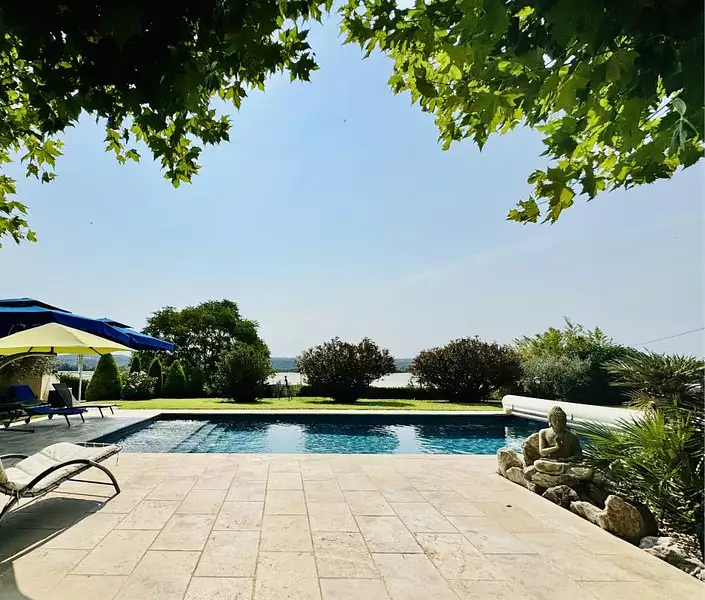 Piscine chauffée avec système PAC (10m / 5 m) avec liner neuf, plage en travertin, volet électrique