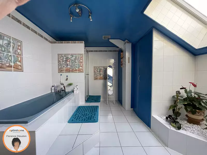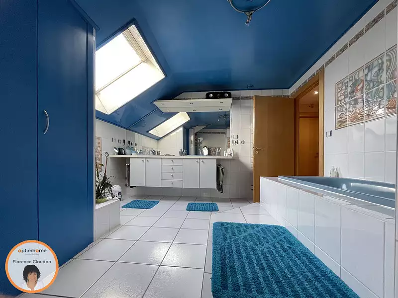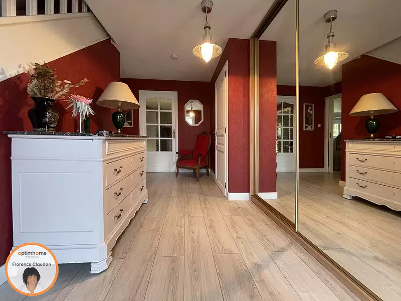 Le dégagement de l' ÉTAGE dessert : quatre chambres toutes équipées de dressings ou placards, salle de bains (douche, baignoire, double vasque sur meuble, placards), WC indépendants, pièce d'appoint (arrivée et évacuation d'eau prévues pour une éventuelle 2ème salle de bains).