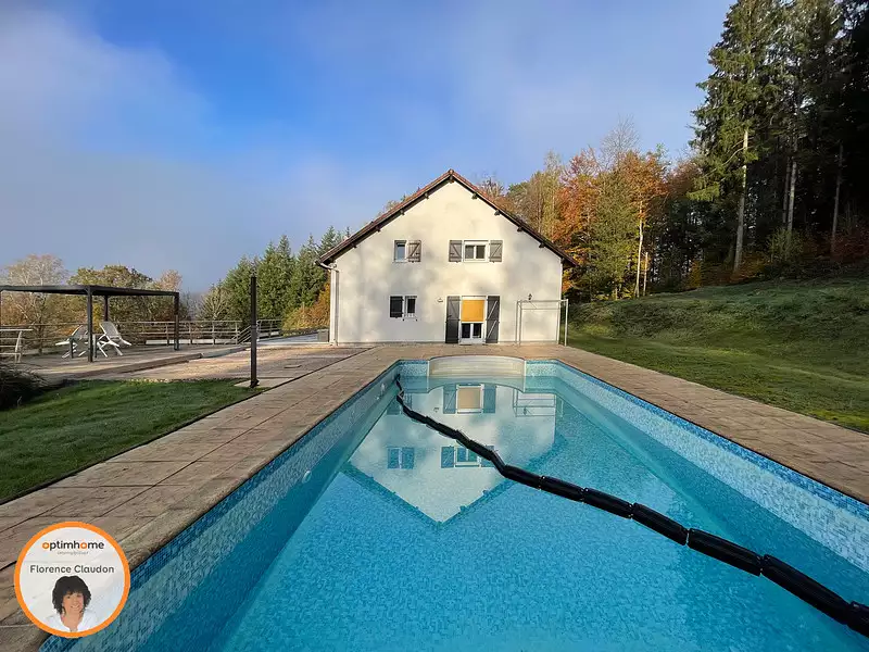 Elle est édifiée sur une propriété fermée de 10824 m² dont un TERRAIN PAYSAGÉ d'environ 4000 m² avec PISCINE chauffée et le reste en FORÊT.