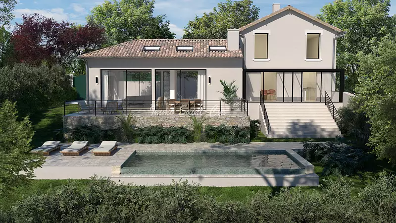 Un jardin de 1 121 m2 avec terrasse et piscine. Un garage et une cave en dépendance.