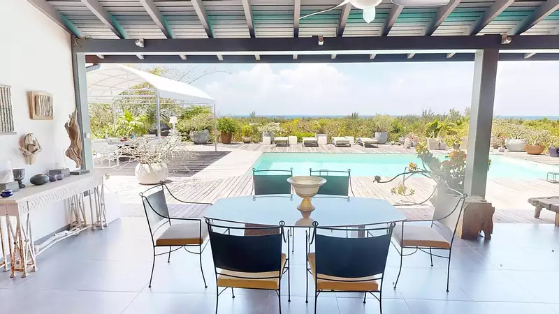 Offrant de superbes volumes et une atmosphère apaisante, la villa séduit par son vaste espace de vie ouvert sur une large terrasse, la piscine et une vue imprenable sur la mer.
