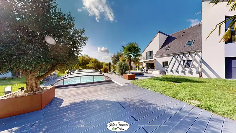 Pour une parfaite harmonie entre l'intérieur et l'extérieur, depuis le salon vous accédez à une grande terrasse, une piscine de 40 m² avec son dôme coulissant, un spa, un pool house de 25 m², un potager et des arbres fruitiers - une ambiance qui invite clairement à déconnecter.