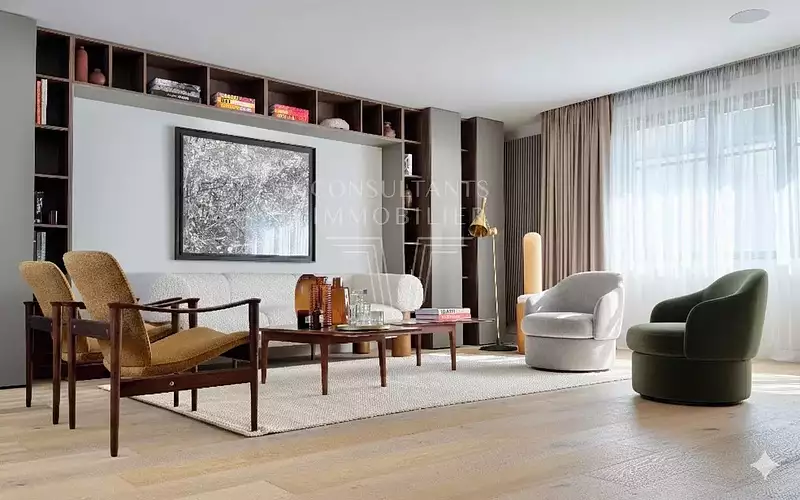 un bel espace de vie lumineux et ensoleillé avec sa terrasse et sa cuisine contemporaine entièrement équipée, Au 3ᵉ et dernier étage : une vaste chambre de maître avec salle de bain et dressing.