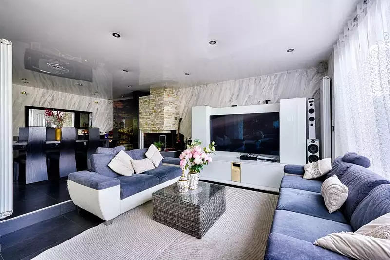 Pièce de vie de 75 m² lumineuse avec cuisine américaine.